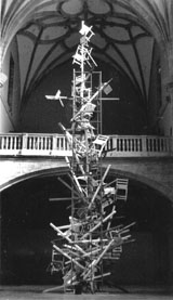 Pues bien, las instalaciones de J. Ignacio Díaz de Rábago muestran, entre otras cosas, los múltiples pasajes existentes entre el ámbito interior y el exterior. En la serie de instalaciones bajo el título ”La Biblioteca de Babel”, Díaz de Rábago ilustra de manera sumamente sugerente la faceta abismal de una biblioteca cualquiera. Los libros que levitan -¿o caen?- hacia lo alto y amenazan con destruir el estricto orden de catalogación de una biblioteca, muestran cómo el individuo corre el peligro de perderse en la tradición cultural. Quizá sea factible que un lector diestro interiorice el contenido de una biblioteca dada, pero las referencias inscritas en los volúmenes de esa misma biblioteca, referencias que llevan a toda la historia de la cultura universal, excederían en cualquier sentido tanto la exterioridad como la interioridad de ese mismo lector. Por otro lado, la referencia al relato bíblico de la torre de Babel, también sugiere la continuidad entre lo interior y lo exterior. En el relato que aparece en el libro 11 del Génesis, se narra cómo del interior del hombre surge la ambición de alcanzar los cielos y cómo esa ambición se torna concreta, exterior, en forma de una gigantesca torre. Esta construcción es, no obstante, frustrada por intervención divina, y el espectador de la instalación ve expuesta la futilidad de ese sueño atemporal, que se manifiesta de tantas maneras exteriores, de ser dueño de todas las cosas.